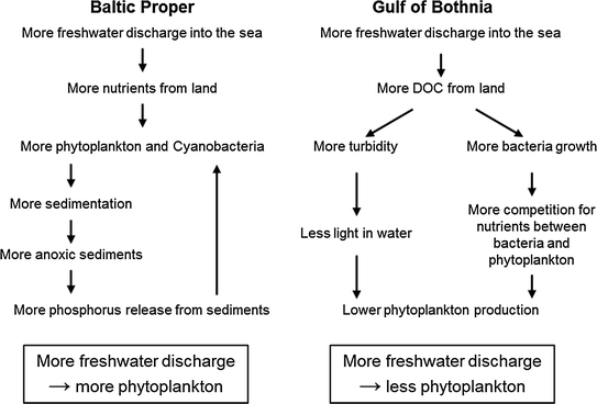 In the Gulf of Bothnia, increased freshwater runoff may lead to enhanced microbial activity and a decrease in phytoplankton primary production. This is because, in addition to nutrients , river discharge in this area carries a large load of dissolved organic carbon (DOC). The DOC reduces the amount of light reaching the phytoplankton (Pettersson et al. 1997) and also serves as a substrate for bacteria which at carbon substrate sufficiency may outcompete phytoplankton for nutrients (Mindl et al. 2005).