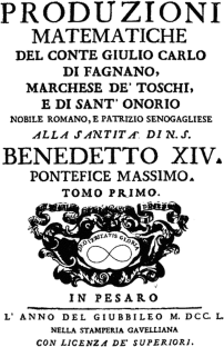 G.C. di Fagnano, Metodo per misurare la Lemniscata, Schediasma II. G. Letterati d’Italia 29, 258 (1718) and the following ones. Republished in Produzioni Mathematiche. II (Pesaro, 1750), pp. 343–348