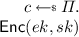 . \(ch \leftarrow \varPi .\mathsf {Enc}(ek, s^*)\). \(vk' \leftarrow (vk, ek, ch)\). \(sk' \leftarrow (sk, s^*)\). Return \((sk', vk')\). -