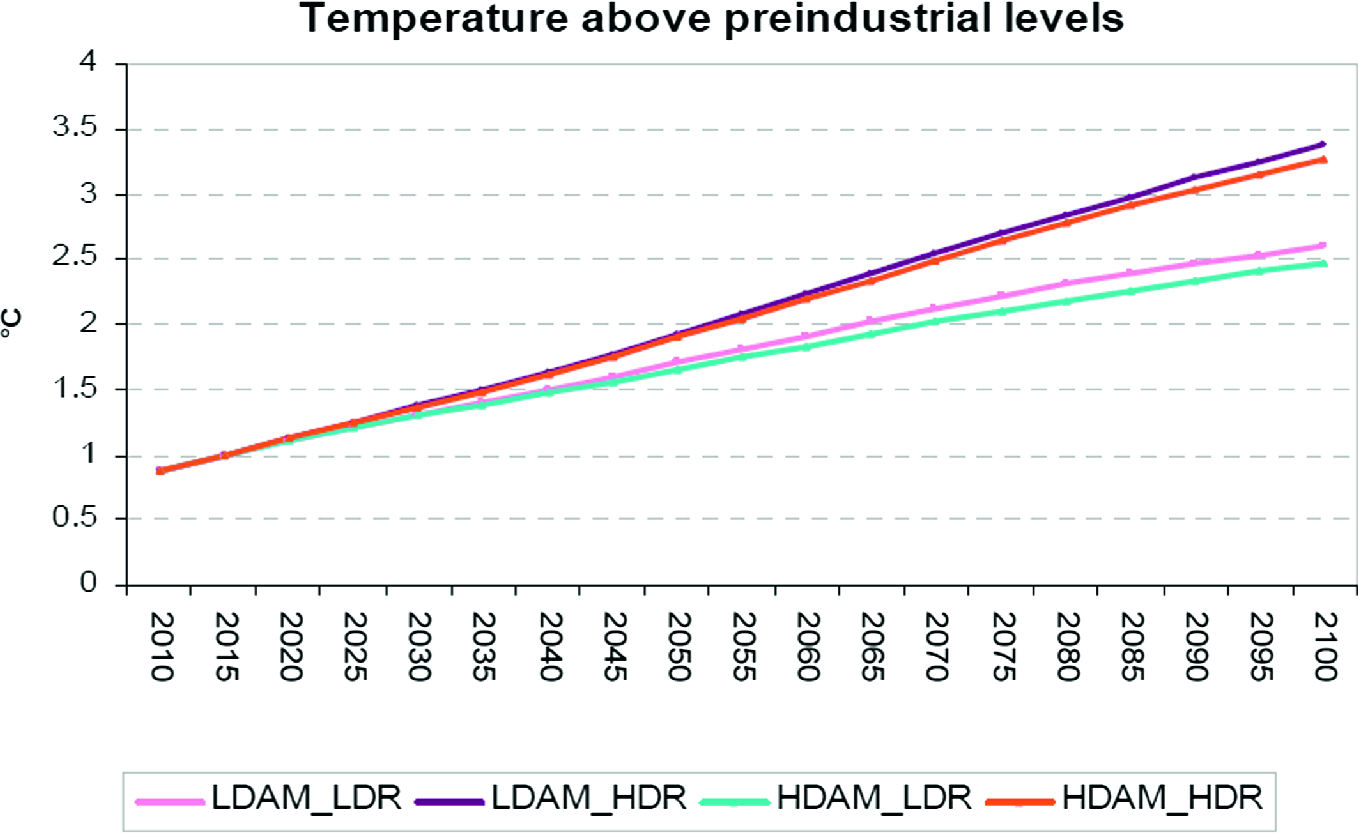 Figure 14.2 shows the temperature pathways for four scenarios: (i) low damage/low emissions with a low discount rate (LDAM-LDR), (ii) low damage/low emissions with a high discount rate (LDAM-HDR), (iii) high damage/high emissions with a low discount rate (HDAM-LDR), and (iv) high damage/high emissions with a high discount rate (HDAM-HDR). The high discount rate case is the one where the rate is set initially at 3% and then declines over time as in the IAMs WITCH, DICE and RICE (see Nordhaus and Boyer 2000). The low discount rate is case is the one where the rate is set as 0.1% and then declines as in Stern (2007). To keep the analysis simple we consider only versions (ii) and (iii) of their analysis and use them to calculate residual damages over time. This provides a broad range of estimates.