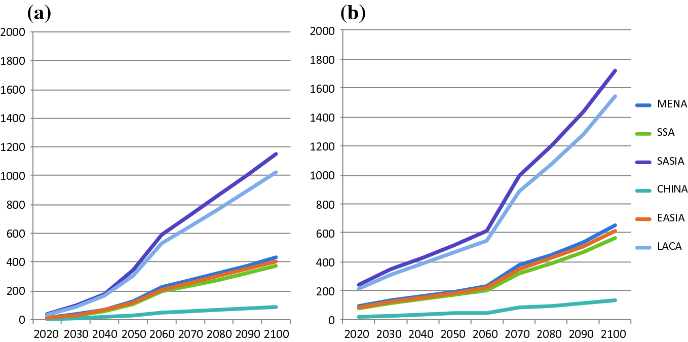 At a regional level Bosello et al. (2010) find that the effects of increasing temperature are greatest for South Asia, followed by East Asia and Sub Saharan Africa and then by the Middle East (MDE). The sector most sensitive to temperature increases is agriculture, followed by tourism. Costs related to energy decline with temperature in this range (as reduced demand for heating dominates the increased demand for cooling). One can expect therefore a decrease in the temperature target to 2 °C or even 1.5 °C to result in residual costs that are correspondingly lower than the estimates given in Table 14.4.