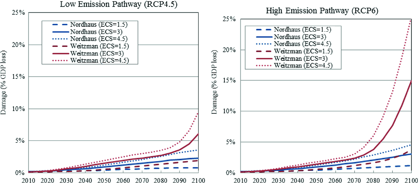 Figure 14.5 shows the combined effect of the damage when the uncertainty in the ECS and in the damage function choice is considered. We show, using the DICE model, the damage (as % of global GDP) for the Nordhaus and Weitzman damage functions and for three values for the ECS-1.5, 3 and 4.5. The damages are estimated for a low and high emission pathway scenario (RCP 4.5 and RCP 6), which are close to the ones reported in Sect. 14.3.2. We can see that the range of the damages is low before 2050 but then expands substantially at the end of this century. The damage per annum by 2100 in the low emission pathways could be 0.8% in the best case scenario (Nordhaus and ECS = 1.5) and 9.5% in the worst (Weitzman and ECS = 4.5). Similarly, the damage in the high emission pathways could range between 1.2 and 25% in the more extreme situations.