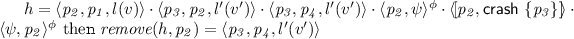 is the first such notification issued by a participant based on its local failure detector. Adding the notification into the global queue instead of making the coordinator immediately aware of it models that failures are only detected eventually. Note that a failure is not annotated with a level because failures transcend all levels, and asynchrony makes it impossible to identify “where” exactly they occurred. As a failure is permanent it can affect multiple try-handles. The (Crash) rule does not apply to participants which are robust, i.e., that conceptually cannot fail (e.g., \( {dfs} \) in Fig. 2). Rule (Crash) removes channel \(\textsf {s}[ p ]\) (the failed process) from application N, and removes messages and notifications delivered from, or heading to, the failed \( p \) by function \(\textit{remove}(h, p )\). Function \(\textit{remove}(h, p )\) returns a new queue after removing all regular messages and notifications that contain \( p \), e.g., let