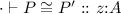 Let \(\vdash M : \tau \), \(\vdash N : \tau \), \(\vdash P~{:}{:}~z{:}A\) and \( \vdash Q~{:}{:}~z{:}A\).