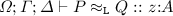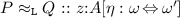\(P \approx _{\mathtt {L}}Q~{:}{:}~ z{:}X [\eta : \omega \,\!\Leftrightarrow \!\,\omega '] \text { iff } (P,Q) \in \eta (X)(z)\)
