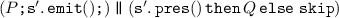 We are more liberal than Esterel where \(\mathop {\mathtt {emit}} \) cannot be called sequentially after \(\mathop {\mathtt {pres}} \).