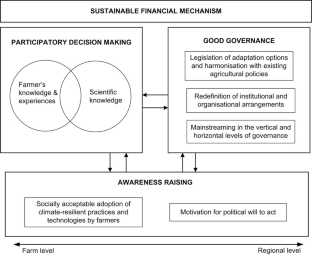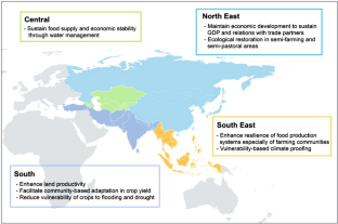 Climate change adaptation in agriculture involves a systematic process of understanding, planning, implementation, and evaluation including structural and non-structural measures across various decision-making spheres. Generally, climate change adaptation in the agriculture sector in Asia is now primarily undertaken under the tenets of achieving food security and safety. The mode of implementation of climate change adaptation in agriculture varies across countries in Asia mainly because of the heterogeneous historical development of the region’s (1) sectoral policies on the environment and natural resources; and (2) utilisation of the land and water resources that are closely knitted to cultural identity. The common vision for agriculture in Asia under a climate change scenario is resilience of the food production system in terms of (1) enhancement of crop yields to sustain the population demand; (2) economic stability; and (3) reduction in vulnerability of farming communities. Clearly, the differences among countries can be attributed to the varied understanding of climate change and its spatial and temporal implications as well as the country’s level of economic growth. A trend among country reports suggests that climate change adaptation in agriculture is a combination of policy, research, and developmental discussions on food security and environmental governance. Overall, countries in Asia require access to sustainable financial mechanisms in order to support policy, research, and developmental projects on CCA in agriculture.