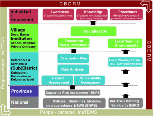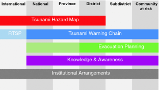 Establishing the Tsunami Early Warning System in Indonesia (InaTEWS) has been a process of learning and innovation. Three different initiatives, implemented by the German-Indonesian Cooperation for a Tsunami Early Warning System (GITEWS), the Indonesian Institute of Sciences (Lembaga Ilmu Pengetahuan Indonesian—LIPI) and the United Nations Educational, Scientific and Cultural Organization (UNESCO), contributed to the learning and innovation process with a strong focus on tsunami preparedness at the community level during the implementation phase of InaTEWS. The lessons learned as well as the tested and validated procedures resulting from this innovative process have been documented and are currently being extended to make them available nationwide. Experiences from the pilot phase show that there is still a great need to strengthen the capacity of national government institutions, local governments and civil society in order to provide the services necessary for sustainable tsunami preparedness. Key points for the way ahead are building a better understanding of the system, the warning service and the contents of warnings, strengthening the role of local disaster-management agencies and governments as well as the institutionalization of early warning at all levels and to systematically scaling up the successful experiences from pilot areas.