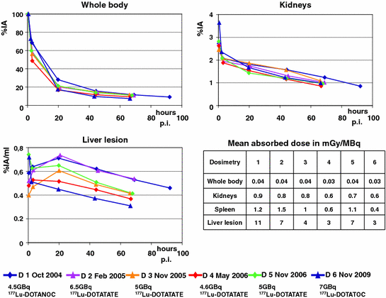 Moreover, the results obtained for one patient treated with six cycles of PRRNT using different peptides showed variable kinetics and mean absorbed doses, for which no ascending or descending order for consecutive therapies was found. This effect was also seen in patients who received more than one cycle of therapy using 177Lu-DOTATATE (data not shown). Consequently, dosimetry for one cycle of PRRNT should not be used alone to predict the outcome of future following cycles, even if the same peptide is used.