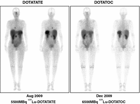 Whole-body scans at 20 h p.i. in a patient treated with 177Lu-DOTATATE and 177Lu-DOTATOC (scaled to the maximum pixel of both scans)