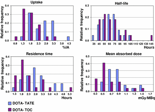 Esser et al. (2006) compared 177Lu-DOTATATE and 177Lu-DOTATOC in seven patients and found also longer residence time in kidneys with DOTATATE. They concluded, however, that DOTATATE would be the better peptide for PRRNT based on the finding that the ratio of residence times of DOTATATE to DOTATOC in tumor was higher than that for kidneys and hence DOTATATE gives a higher dose to the tumor. On the other hand, Forrer et al. (2004) found no significant difference in mean absorbed dose to kidneys. In our study, the mean absorbed kidney dose was significantly higher for DOTATATE than for DOTATOC due to significantly higher renal uptake and longer residence time in kidneys.
