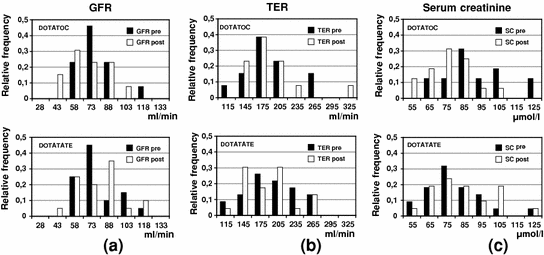 Comparison of pre- and post-therapy renal parameters in patients treated with DOTATOC and DOTATATE: a GFR, b TER, and C serum creatinine
