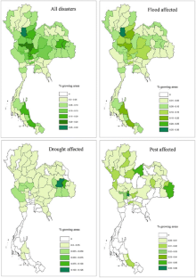 Without actual payout statistics, we assume that under the existing program, if household’s actual crop income falls below its 1-in-3 year trigger level, they will be paid 3,787 baht per hectare (606 bath/rai) under disaster relief program and an extra 6,944 baht per hectare (1,111 baht/rai) if they pay for disaster insurance coverage at a subsidised price of 375 baht per hectare (60 baht/rai). We believe this assumption is reasonable, as (1) the program covers larger sets of disasters and (2) it makes payout conditional on government’s declaration of disasters at very local levels with required actual loss verification. Because government disaster insurance is offered at highly subsidised price, our welfare optimisation implies that all representative risk-averse households will purchase full coverage. Hence 100 % insurance penetration rate is used. Note that we abstract from all the incentive problems associated with existing program that could result in larger exposure on government spending.