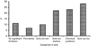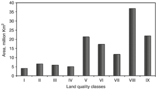 Including rocky surfaces, deserts, and ice-covered areas, there is 130,575,894 km2 land area in the globe. About 38.5 million km2 (29.45 % of the earth’s ice-free land surface) is too dry for human habitation, and about 20.2 million km2 (15.46 %) of the land occuring in the cold tundra zone is not much suitable for normal agriculture. Saline and alkaline soils occur in 3,105,000 km2 (2.4 % of the land surface), and soil acidity affects 18,420,100 km2 (14.1 % of the total land). Only about 12 % of the land surface is suitable for food and fiber production, 24 % is grazing land, and about 31 % is forestland; the remaining 33 % has many constraints for most uses. The lands are classified into 8 land capability classes based on their productivity, limitations, climate, and soil conservation requirements. Class I land is the most suitable agricultural land, and Classes VII to VIII are not suited for cultivation. Agricultural soils are again classified into nine land quality classes based on the integration of three soil performance classes and three soil resilience classes. Land quality I is the prime land. Suitability of cropping and productivity gradually decrease from Class I to Class IX. The global arable land area is estimated to be 1.351 billion hectares, and 38 % of the arable land has been degraded at variable intensities. The principal cause of soil degradation is the land mismanagement. GLASOD identified five main causes of soil degradation, including deforestation, overgrazing, mismanagement of agricultural land, overexploitation of vegetation, and (bio-) industrial activities. There are five types of land/soil degradation: water erosion, wind erosion, physical deterioration, chemical deterioration, and degradation of biological activity. With this background, ten “laws of sustainable soil management” have been suggested.