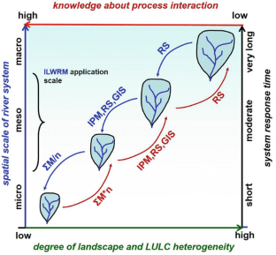 Methodological aspects of scale-related impact assessment from changing land use/land cover (LULC) management and climate on river basin water resources and their management are discussed. Both control the interactive hydrological process dynamics that transfer precipitation input on the landscape to the different surface and subsurface water resources components and ultimately to river runoff draining the river basin. As the integrated water resources management (IWRM) concept does not sufficiently account for the landscape-related process dynamics associated with LULC management, it is enhanced to the integrated land and water resources management (ILWRM) approach. The latter requires, firstly, a consistent methodological concept and, secondly, a toolset for its implementation. The DPSIR (D = Drivers, P = Pressures, S = State, I = Impacts, R = Responses) approach is a suitable analysis concept in this regard and is enhanced by a Decision Information Knowledge System (DIKS). Both are implemented by means of the integrated land management system (ILMS) toolset developed at the University of Jena, Germany, and tested in numerous research projects in Africa, Asia, Australia, Europe and South America. The majority of river catchment studies focus on a particular scale. Upscaling and downscaling of the hydrological knowledge they generate requires the separation of the generic knowledge components from their modifying local specifications. The interdisciplinary ILWRM applications presented in this paper from two projects in South Africa and SE Asia address this challenge by applying a multi-scale nested catchment approach (NCA) and respective upscaling and downscaling techniques to regionalize hydrological knowledge between scales.