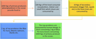 Primary production means indirect consumption of phytoplankton and algae by human for each unit of marine predator (bluefin tuna or shark or whale) consumed.