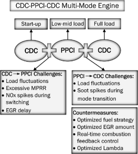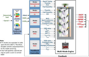 Low temperature combustion (LTC) modes offer high thermal efficiency and low engine-out NOx and soot emissions. The common LTC modes include homogeneous charge compression ignition (HCCI), partially premixed charge compression ignition (PPCI), and reactivity-controlled compression ignition (RCCI). To realize these promising LTC modes, optimal combustion control of the engine in each LTC mode is required. This will require precise control of combustion phasing and engine load, while constraining engine variables including peak in-cylinder gas pressure, maximum pressure rise rate, high intensity ringing or knock, and coefficient of variation of indicated mean effective pressure (IMEP) to allow safe and stable combustion. This chapter explains state-of-the-art of LTC engine control, including dynamic modeling, model predictive combustion control, experimentation, and implementation of real-time closed loop combustion controllers. A well-recognized limitation of LTC engines is a constrained optimal operating range. To this end, multi-mode engines are desired. These include (i) multi-mode LTC engines with mode transition among LTC modes, e.g., dual mode HCCI-RCCI engine, or triple mode HCCI-PPCI-RCCI engine, and (ii) multi-mode engines including LTC and conventional combustion modes, e.g., dual mode HCCI-SI (spark ignition) engines or dual mode RCCI-CDC (conventional diesel combustion) engines. These demands for innovative combustion controllers that capture the engine transient dynamics such as in-cylinder air–fuel ratio variations or residual gas temperature variations during mode transitions. This chapter introduces multi-mode LTC engines and explains controller development for these engines.