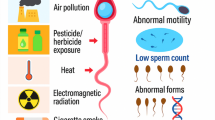 Another major factor that may contribute to male infertility is exposure to excessive heat at the workplace or due to climate change. Temperature plays a crucial role in maintaining normal spermatogenesis in testes. The scrotal temperature is 2–4 °C lower than the core body temperature [101, 102] and any factor that causes a rise in scrotal temperature will affect the spermatogenesis process resulting in male infertility [103]. Furthermore, it was observed that 1–1.5 °C elevation in scrotal temperature can result in impaired sperm production (oligozoospermia, azoospermia, teratozoospermia), and sperm morphological abnormalities [104]. Environmental stresses, such as a temperature rise, resulting in the activation of heat shock protein (HSP). Of these the most important is HSP70s, one of the major classes of proteins induced by elevated temperatures. They are responsible for the folding, assembly, and disassembly of other proteins [105] and are known to play a crucial role in spermatogenesis [106]. Hence, any factor that perturbs their normal expression and regulation results in an adverse impact on male fertility [107]. A study on 37 infertile men (cases) and 13 fertile men (controls) reported that HSP 70 levels were significantly increased in the infertile group as compared to fertile males, thereby concluding that HSP 70 expression increases in spermatozoa of infertile men as a protective mechanism against apoptosis [108]. Constant exposure to high temperatures as seen in cases of occupational exposure to radiant heat in people working in furnaces, bakeries, welding or ceramic factories, those working for long hours in kitchens, laundries, dry cleaning shops, or drivers can result in loss of thermoregulatory function of scrotum affecting one or more component of semen quality in males [103, 109]. This fact was further supported by a study that revealed that tight undergarments in men also lead to a rise in scrotal temperature resulting in decreased sperm concentration, total sperm count, motility, and hence, male infertility [110]. It was observed that higher scrotal temperatures result in a rise in testicular metabolism without the surge in blood supply, leading to local tissue hypoxia and oxidative stress [111]. Human spermatozoa are very susceptible to oxidative stress-induced lipid peroxidation because of high levels of polyunsaturated fatty acids (PUFAs) in their plasma membrane [112]. This in turn causes increased production of reactive oxygen species (ROS) which causes increased sperm DNA fragmentation and male infertility [113, 114]. It was demonstrated recently that excessive heat exposure causes decreased sperm motility by downregulating mitochondrial activity and reducing ATP levels [115]. Furthermore, a transient rise in scrotal temperature results in a reversible drop in proteins essential for the spermatogenesis process, gamete interaction, and sperm motility [116]. A recent study on male rats reported that exertional heatstroke can cause erectile dysfunctions, disruption of testicular temperature, poorly differentiated seminiferous tubules, diminished sperm quality, loss of interstitial Leydig cells, Sertoli cells, leading to azoospermia and infertility [117]. Another similar study conducted on bovine sperm also reported that heat stress in bulls induces seminal plasma oxidative stress thereby affecting the sperm mitochondrial function, motility, plasma membrane integrity, and DNA fragmentation, ultimately leading to infertility [118]. Another study observed the impact of wet heat exposure in the forms of hot tubs, Jacuzzi or hot baths in infertile male partners and concluded that the toxic effects of wet heat exposure are reversible, and withdrawal of hyperthermia resulted in increased sperm motility and quality in these patients, further supporting the fact that excessive heat exposure affects sperm parameters and can cause infertility in males [119]. A large longitudinal study including 10,802 Chinese men in Wuhan was conducted to quantitatively evaluate the exposure–response relationship between ambient temperature exposure and semen quality and observed that exposure to extremes of temperature, both high and low was found to be associated with decreased semen quality including reduced sperm concentration, total sperm count, total motility, progressive motility [120]. Another similar study reported that seasonal and monthly temperature variation has a significant impact on the human semen parameters. It was observed in their study that sperm concentration and total amount per ejaculate was significantly lower in summer and higher in winter, whereas the sperm progressive and total motility was found to be higher in spring and summer and lower in autumn and winter [121]. A large data analysis study in Northern Italy to evaluate the impact of environmental temperature and air pollution on semen parameters also reported that total sperm number was significantly lower in summer/autumn and was found to be inversely related with the duration of daylight [122]. Hence, though the data related to the impact of season or climate change on human semen quality is very little, pieces of evidence have been found to link extreme changes of temperature with poor semen quality. Other studies have also reported the impact of seasonal and environmental temperature variation on sperm quality [123,124,125]. Furthermore, many animal studies have also shown that a rise in testicular temperature results in reduced testicular size, decreased sperm production, increased abnormal sperm forms, and reduced motility leading to male infertility [115, 126, 127]. Hence, exposure to high temperatures both due to occupation or environmental factors has a deleterious impact on overall semen quality and can cause male infertility.
