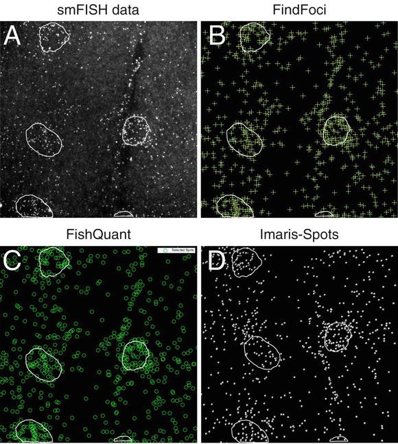 Fig. 4Quantification of transcript number using different spot counting applications. Each application has a GUI that displays which spots are detected as threshold parameters are adjusted. Nuclear regions, which can be segmented automatically with the DAPI channel, are shown here as circled regions. (a) Maximum projected stack of spinning disk confocal images showing MSP-300 smFISH sample. (b) Spots detected using the ImageJ FindFoci plugin. (c) Spots detected using the MatLab FishQuant software. (d) Spots detected using the Spots tool in Imaris