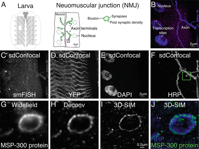 Example of smFISH data acquired from the larva neuromuscular junction (NMJ) with spinning disk confocal (sdConfocal) or 3D structured illumination microscopy (3D-SIM ). (a) Schematic of the larva fillet preparation indicating the location of an NMJ and the major subcellular compartments. (b) Merged 3D projection of a specimen labeled with smFISH probe (magenta) and Alexa 647-conjugated anti-HRP counterstain (blue). Image was acquired on a spinning disk confocal with 60× 1.35 NA oil objective. (c) sdConfocal image of MSP-300-smFISH: a coding region of MSP-300 mRNA was hybridized with a probe set containing 48 short oligos (18 nts) individually labeled with Quasar 570. (d) The MSP-300::YFP fusion protein is easily detected in the smFISH preparation. Nuclei and NMJ axons were labeled with DAPI and Alexa 647-conjugated anti-HRP respectively (e, f). Box in f shows the relative region of a bouton, (see g–j). Enhancement in resolution can be seen by comparing widefield (g) and deconvolved (h) images of the MSP-300 label to 3D-SIM reconstructions (i, j)