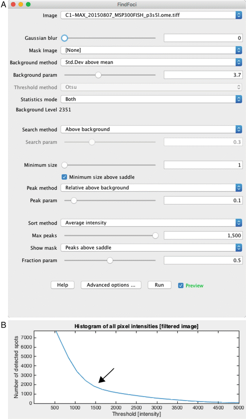 Thresholding parameters for counting spots in the FindFoci ImageJ plugin. With these settings (a) the “Background param” slider is adjusted until all spots are identified in the image. The FISHQuant and Imaris Spots applications use intensity thresholding (b), which is used to provide an initial separation between background and high intensity spots (arrow), which are then refined using additional parameters