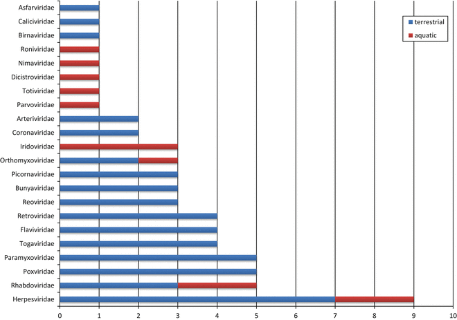 Virus families including members causing notifiable animal diseases. The figure depicts the number of pathogenic members from each virus family causing important diseases in terrestrial and aquatic animals
