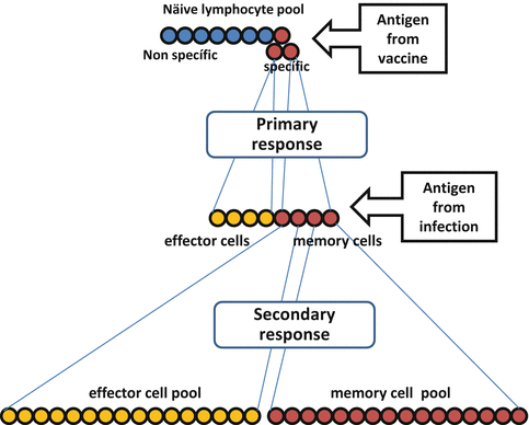 Vaccination exploits the induction of specificity and immunological memory. A primary clonal expansion of lymphocytes is produced upon activation of naïve T-cells by phagocytes primed with specific vaccine antigens/stimulus. Both effector and memory cell pools are generated that upon encounter with pathogen (infection) will undergo a massive secondary expansion of both cell pools (adapted from [33])