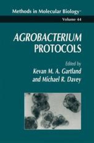 The potato (Solanum tuberosum) is the world’s fourth major food crop. The potato is ideally suited for improvement by modern genetic manipulation methods, as it is highly amenable to a wide range of various tissue-culture techniques (1). In recent years, a combination of cellular and molecular approaches, including somatic hybridization and genetic transformation, have been employed to improve existing potato cultivars (2). Genetic transformation, however, provides a more direct and controlled method for manipulating the genome of potato for both basic and applied research purposes (3). This chapter describes the Agrobacterium-mediated transformation method for potato genotypes. Agrobacterium tumefaciens and its Ti-plasmid have been used extensively as vectors to introduce engineered genes into plants (4). In order for genetic modification via Agrobacterium to be successful, both a reproducible regeneration system and an efficient DNA delivery system directed toward those cells capable of regeneration are mandatory. An ability to select the transformed cells from a large number of untransformed cells is also essential, because transformation frequency is usually between 5 and 50%.