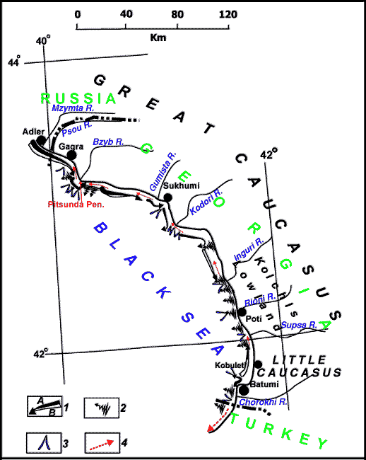1) extends southeast from the Russian border near Adler to the Turkish border south of Batumi, a distance of 312 km. The coastal features are determined by several factors: the coast-parallel structure of the Great Caucasus alternating southward with the large synclinal Colchis Lowland and the Little Caucasus range near Batumi, the narrow and steep sea floor, which allows large waves to reach the coast, the generally southward longshore drifting, and the massive loss of sediment into submarine canyons that cross the shelf in front of the mouths of the rivers Mzymta, Psou, Kodori and Chorokhi.
