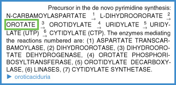 This is a recessive deficiency of the enzyme orotidylate decarboxylase, encoded at human chromosome 3q13 or a deficiency of orotate phosphoribosyl transferase. Rare human diseases have their counterparts in other higher eukaryotes. The clinical symptoms include anemia with large immature erythrocytes and urinary excretion of orotic acid (see Fig. O24). The administration of uridylate and cytidylate alleviates the symptoms. Homologous mutations have been detected in cattle. orotic acid