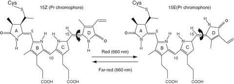 Phytochrome chromophores: The two isomers of phytochromobilin. (See Chen M et al 2004 Annu Rev Genet 38:87; courtesy of Dr. Meng Chen and Dr. Joanne Chory)