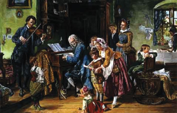 Bach and Bach morning prayer. Morning prayers in the family of Sebastian Bach, painted in 1870 by American artist Toby Edward Rosenthal in Europe. Members of the large family are either playing music or singing. From Music with Ease (http://www.music-with-ease.com); courtesy of Paul Wagner.