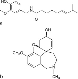 The pungent substance of Capsicum peppers. It may be anticarcinogenic due to its antioxidative function. The capsaicin (vanilloid) receptor is a cation channel required for heat and pain perception. Bradykinin and nerve growth factors activate a G-protein-coupled and tyrosine kinase receptors and phospholipase C signals to the primary afferent neurons. The potentiation also requires the VR1 heat-sensitized ion channel on sensory neurons. PIP2 controls its receptor’s sensitivity (Prescott ED, Julius D 2003 Science 300:1284). The alkaloid galanthamine present in some Amaryllidaceae plants is also supposed to have beneficial effects on some nervous diseases, particularly on Alzheimer disease (see Fig. C20).