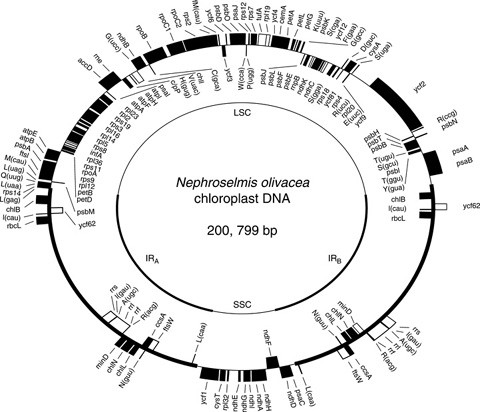 Chloroplast genetics. The chloroplast DNA map of the alga Nephroselmis. LSC: LARGE SINGLE-COPY SEQUENCES, SSC: SMALL SINGLE COPY SEQUENCES. GENES OUTSIDE THE LARGE CIRCLE ARE TRANSCRIBED CLOCKWISE AND THE INNER SET IS TRANSCRIBED COUNTERCLOCKWISE. THE THICKER LINES ON THE INNER CIRCLE REPRESENT THE TWO COPIES OF THE rRNA GENES (IR). THE GENE SEQUENCES DIFFER FROM SOME OTHER ALGAE AND LAND PLANTS. (From Turmel M et al 1999 Proc Natl Acad Sci USA 96:10248)