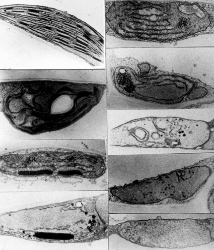 Mutant plastids in Arabidopsis induced by a nuclear mutator gene. At left in the top bloc, a normal chloroplast is shown. Because of the presence of the mutator, within single cells, morphologically different plastids are visible. The mutator shows biparental recessive inheritance. The plastid mutations are transmitted only through the egg. The mutator effect in Arabidopsis has been attributed to defects in the mitochondrial DNA. A similar mutator gene in Oenothera appears to be responsible for template slippage during DNA replication, however the mutations are transmitted through the chloroplast DNA. (From Rédei GP 1982 Genetics. Macmillan, New York)