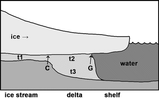 Grounding line wedges or till deltas formed by the deformation of subglacial till (and other sediments) that reach the grounding line. These are fan- or wedge-shaped sedimentary units. The mound’s top surface slopes slightly upward in the direction of flow, due to the pressure of the overlying ice shelf (Fig. 1).