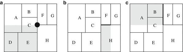 The BA-tree is a k-d-B-tree with augmented border information. (a ) Points affecting the subtotal of F. (b ) Points affecting the x-border of F. (c ) Points affecting the y-border of F