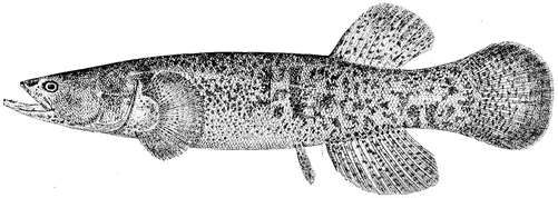 Alaska blackfish (Dallia pectoralis) – a fish of the Dallidae family, inhabiting the Chukotka water basin. The body is black and brown. The dorsal and caudal fins are fringed with a thin orange stripe which turns red during the spawning period. The length is 20 cm. The spawning is fractional from May to July. A. B. feeds mostly on wrigglers. In winter it digs into silt and often gets frozen into the ice, staying alive for a long period, but still dying in significant amounts. It is not important for trade and industry.