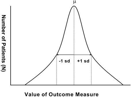 For any outcome variable, a group of patients will typically exhibit a normal distribution of values (Fig. 1). That distribution will have a mean value (µ) and a standard deviation (sd). About 68% of the patients will express a value between one standard deviation less than the mean value, and one standard deviation greater. The outcome measure may be pain scores or any other outcome of interest.