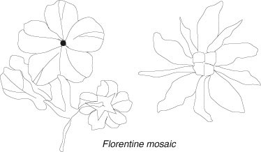 a picture or pattern design formed by small, opaque, geometrically shaped, varicolored fragments of ornamental hardstones such as lapis, turquoise, malachite, azurite, marble, and coral, named as florentine mosaic. The patterns are usually of flowers, or natural scenes, and are cemented on a background of white or black marble. Used for making boxes and plaques, or sometimes as ornaments. Materials used for florentine mosaic are pieces of colored stones such as marble, malachite, opal, turquoise, lapis lazuli, coral. Also known as