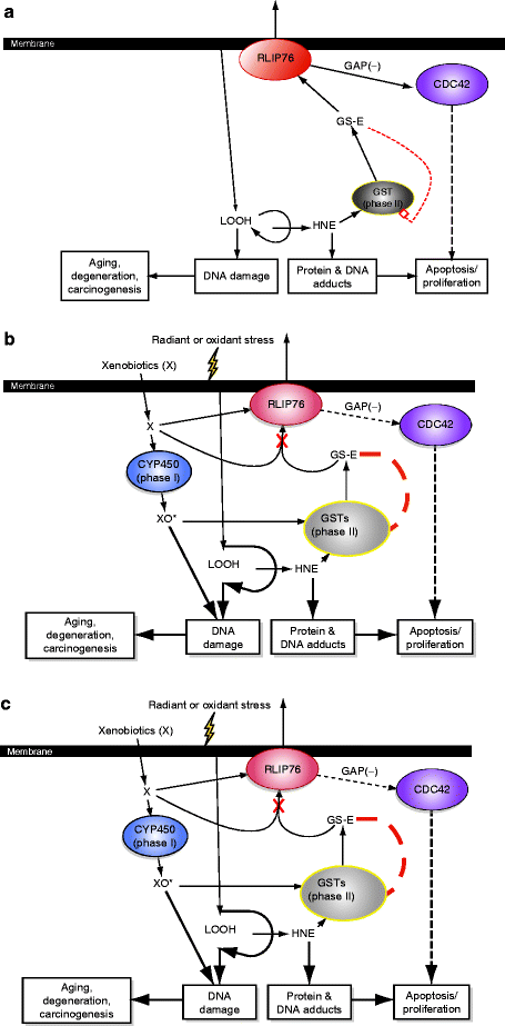 (a) At normal levels or absence of increased stress, a baseline level of lipid hydroperoxide generation from membrane lipids gives rise to radicals. 4-hydroxynonenal (4-HNE) and other lipid aldehydes as well as peroxides are processed by GSTs to glutathione conjugate (GS-E) which are transported in an ATP-dependent manner by RLIP76 and other transporter proteins. The concentration of GS-E is low. Because of low concentration of GS-E, RLIP76 is balancing between transport and GAP (toward cdc42), thus inhibiting this proapoptotic pathway. Under conditions of low HNE, formation of DNA adducts is kept low and cell proliferation (marked bold) is favored. (b) Under the conditions of stress, lipid peroxidation is increased resulting in a greater amount of toxicity and greater amount of HNE formation, which is catalyzed to GS-E by the various GSTs. Because of the rise in GS-E product, some product-inhibition of GSTs occurs until RLIP76 activity is increased. If xenobiotic toxins (chemotherapy drugs, carcinogens) are also present under these condition, a competition arises between lipid metabolites and activated P450 metabolites (XO*) for GST-mediated conjugation with GSH, the concentration of XO* rises more rapidly, and genotoxicity is enhanced, particularly because XO* can propagate themselves via lipid peroxidation. Because of increased transport substrate, GS-E, the transport activity of RLIP76 is favored over its GAP activity toward cdc42, partially releasing that inhibition. The net effect, depending on the severity of stress, would result in decreased proliferative signals and increased tendency to apoptosis (marked bold), both as a result of loss of cdc42 inhibition, and as a result of increased electrophilic lipid or xenobiotic oxidation products. (c) If RLIP76 is inhibited under conditions of stress, not only is there rapid accumulation of GS-E, but inhibition of GSTs by GS-E results in accumulation of XO*, which are also formed more rapidly because of increased substrate xenobiotic due to lack of the xenobiotic efflux activity represented by RLIP76. Under these conditions, genotoxicity and apoptosis signaling are greatly increased and proliferation is diminished