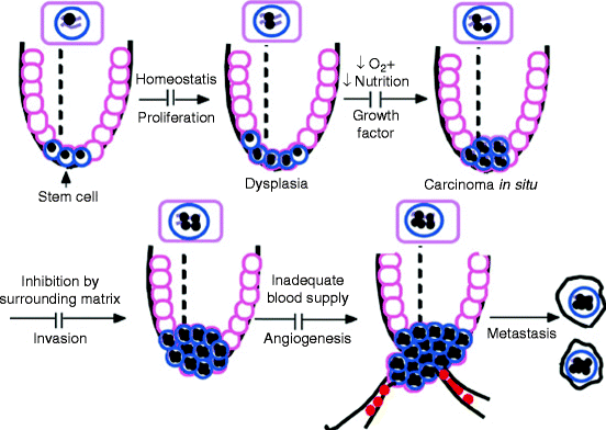 The ability of cancer cells to express a mutator phenotype provides a mechanism for tumor cells to circumvent the host’s mechanisms that determine when cells divide and their position within tissues. As tumors expand, they encounter a sequence of restrictive blockages that curtail further expansion. As indicated in Fig. 1, impediments to expansion include the architecture of surrounding tissues, reduced nutrition, decreased oxygen, need for growth factors, and inadequate blood supply. Each of these impediments can be overcome by the selective clonal expansion of cancer cells with mutations in genes that impart the required phenotypes. Some of these mutations could be selected from a population of cells harboring multiple mutations. Others could result from new mutations induced by additional mutations that render genetic stability genes error prone. Thus, with each round of selection there would be a “piggy-backing” of mutations in genes that increase the overall mutation frequency in cancer cells. In order for a mutator phenotype to account for the many mutations in a cancer cell, it would have to be present early during the course of tumor progression. The continued expression of a mutator phenotype might not be compatible with the enhanced growth of cancer and thus may not be exhibited by cancer cells by the time a tumor is clinically apparent. Nevertheless, the footprints of its presence, multiple mutations, would persist in all cell descendents throughout the course of tumorigenesis ( Multistep Development).