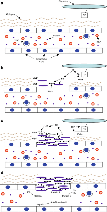 The properly functioning hemostatic system requires an orchestrated interaction between coagulation factors, Von Willebrand Factor, platelets, endothelial cells of blood vessels, and the extracellular matrix (Fig.