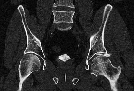 This pelvic coronal CT image identifies a displaced posterior wall fracture fragment that is located between the femoral head and acetabular dome causing a nonconcentric reduction. This was one of five separate displaced posterior wall fracture fragments that were noted to be within the joint. An open reduction was indicated and performed urgently. The displaced fracture fragments were first removed from the hip joint so the femoral head could be congruent with the acetabular dome. Then the individual fragments were reduced and stabilized with two supporting plates
