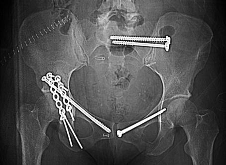 This patient (previously seen in Fig. 3) had a right transverse acetabular fracture-dislocation as well as left pubic ramus fracture and SI joint disruption. The acetabular fracture was treated operatively using a posterior Kocher-Langenbeck exposure. The reduction was accomplished after cleaning the fracture surfaces and then clamping the transverse fracture. A cancellous lag screw was inserted percutaneously in the superior pubic ramus, and then two malleable plates were applied posteriorly to stabilize the transverse fracture. The SI joint injury and pubic ramus fracture were treated with closed reduction and then screw fixation. An initial iliosacral cancellous lag screw compressed the SI joint, and the subsequent fully threaded cancellous screw provided additional support. The acetabular lag screw, iliosacral screws, and the retrograde superior pubic ramus screw were all inserted percutaneously using biplanar fluoroscopic imaging