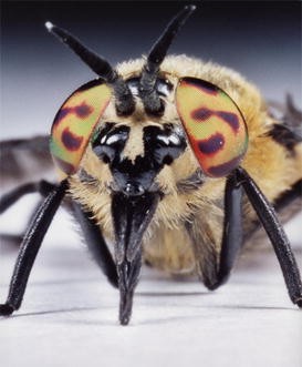 Scanning electron micrograph of the head of a large specimen of the genus Tabanus. Note the extremely large compound eye, the saw-like mouthparts, and the horn-like left antenna. Tabanids search their prey by help of their compound eyes, which recognize movements of potential prey over far distances