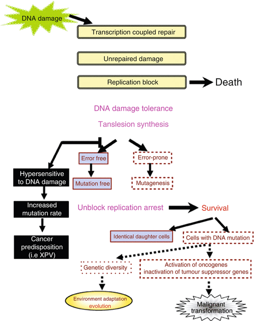 Schematic summary of consequences of DNA damage in mammalian cells. Note that DNA damage tolerance mechanism promotes cell survival, and defects in error-free translesion DNA synthesis result in predisposition to cancer