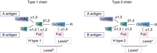 Schematic representation of type 1 and type 2 ABH and Lewis antigens. Histo-blood group A is defined by the α1,3 terminal GalNAc, histo-blood group B is defined by the α1,3 terminal Gal, and the absence of further elongation of the H structure is characteristic of histo-blood group O individuals. Synthesis of type 1 Lewis antigens (Lea and Leb) and type 2 Lewis antigens (Lex and Ley) depends upon the activity of fucosyltransferases (see text for details). GlcNAc N-acetyl-glucosamine, Gal galactose, GalNAc N-acetyl-galactosamine, Fuc fucose; A antigen, histo-blood group antigen A; B antigen, histo-blood group antigen B
