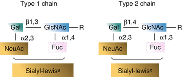 Schematic representation of sialylated Lewis antigens – sialyl-Lea and sialyl-Lex. NeuAc, sialic acid (neuraminic acid)