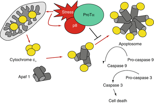 p8 and prothymosin alpha (ProTα) are required for caspase inhibition in stressed cells. In response to apoptogenic stimuli, Apaf1 oligomerizes with cytochrome c to form the apoptosome that recruits and activates caspase 9 that, in turn, activates effector caspase 3. Following a stress p8 and (ProTα) complex impedes apoptosome formation, which prevents caspase 9 activation and blocks the apoptotic cascade